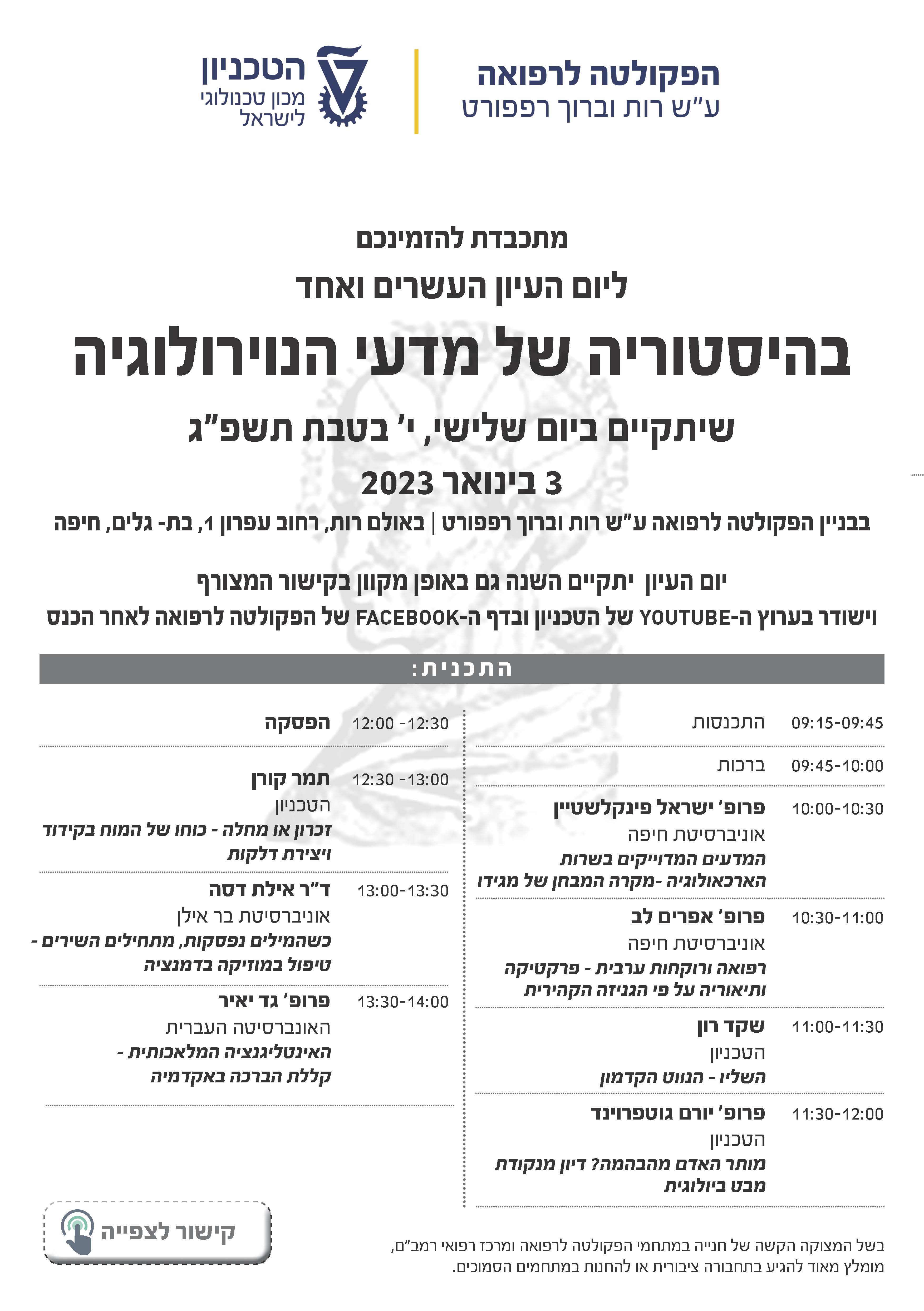 ראשי » אירוע » יום העיון ה-21 בהיסטוריה של מדעי הנוירולוגיה | 3/1/2023 | הפקולטה לרפואה בטכניון יום העיון ה-21 בהיסטוריה של מדעי הנוירולוגיה | 3/1/2023 | הפקולטה לרפואה בטכניון תאריך/זמן 03/01/2023 / כל היום קטגוריות: כנסים בארץ הפקולטה לרפואה בטכניון שמחה להזמינכם ליום עיון ה-21 בהיסטוריה של מדעי הנוירולוגיה, שיתקיים ביום שלישי ה- 03.01.2022. הקליקו כאן לקישור לצפייה